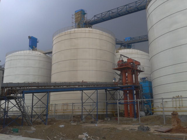 大型钢板库库顶采用网架结构,库内置抗风立柱根据钢板库高径比采用螺旋焊管或国标槽钢,直径400以上螺旋焊管内灌注混凝土,满足了钢板库水平方向的受力要求;钢板库外置环形加强筋采用国标槽钢,间距1.5米左右一环,环形加强筋的使用满足了钢板库内物料涨力的要求,也起到了库体加强作用。抗风立柱和环形加强筋形成钢板库骨架结构,充分发挥了库体的网架性能,在保证钢板库安全使用的前提下,减少钢材使用量,为客户节约了成本。欢迎广大新老客户来电咨询。